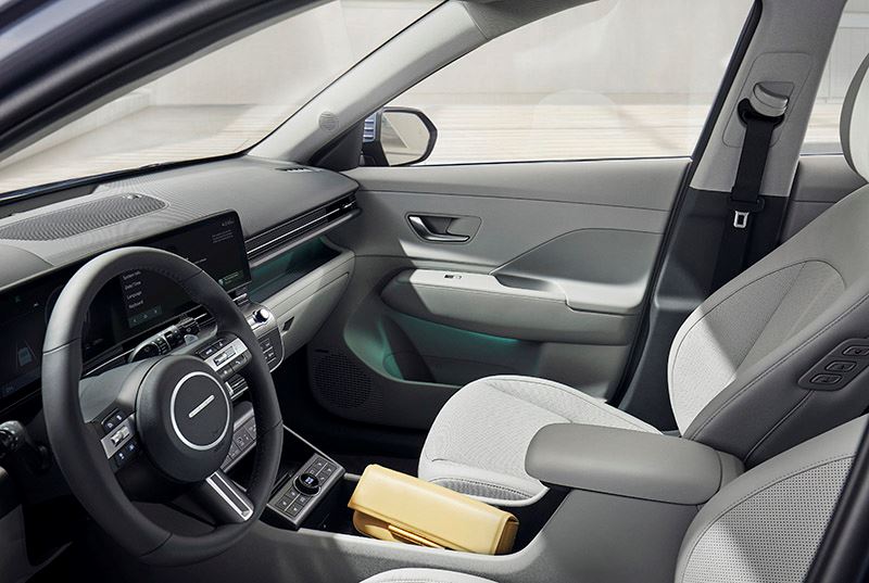 - De op de bestuurder gerichte cockpit wordt geaccentueerd door de twee geïntegreerde panoramische beeldschermen van elk 12,3 inch die het hightech karakter van de KONA benadrukken.