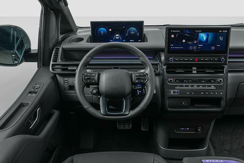 Het interieur is voorzien van twee 12,3-inch displays, Hyundai’s nieuwste ccNC-infotainmentsysteem, draadloze Apple CarPlay™ en Android Auto™, Over-The-Air (OTA) updates en Vehicle-to-Load (V2L)-functionaliteit. Daarnaast is de STARIA Electric uitgerust met een uitgebreid pakket Hyundai Smart Sense-rijassistentiesystemen, met onder meer:
