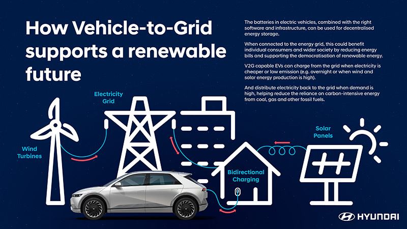 Om de transitie naar hernieuwbare energie te ondersteunen, biedt innovatieve Vehicle-to-Grid-technologie (V2G) een oplossing. V2G is de technologie waarbij een elektrische auto – met de juiste technologie aan boord – (hernieuwbare) energie retourneert aan het elektriciteitsnet, ook wel ‘grid’ genoemd. Daarmee is bijvoorbeeld een huishouden of een kantoor te voorzien van stroom. Niet alleen berijders van een EV, maar hele samenlevingen kunnen hiervan profiteren. Een van de weinige auto’s die zowel stroom kunnen ‘nemen’ als ‘geven’ (= bidirectioneel laden) op dit moment zijn de IONIQ 5 en de IONIQ 6 van Hyundai.