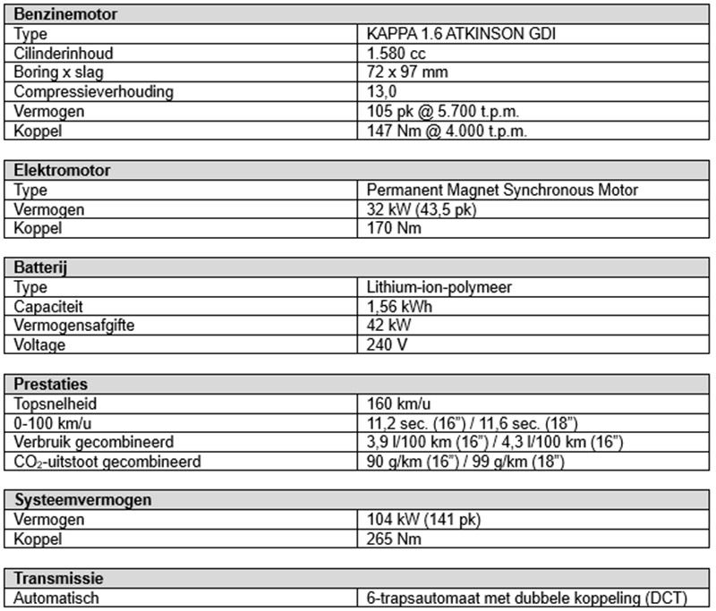 De Hyundai KONA Hybrid maakt gebruik van een 1.6-liter Kappa GDi-benzinemotor en een batterij die opgeladen wordt tijdens het remmen. De benzinemotor is specifiek ontworpen voor de hybride-aandrijflijn en levert een vermogen van 77,2 kW (105 pk). De toonaangevende elektromotor is goed voor 32 kW (43,5 pk), waarbij het maximumkoppel van 170 Nm direct vanuit stilstand beschikbaar is voor een pittige respons bij het accelereren.