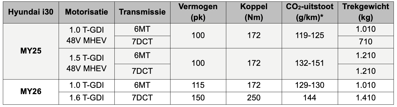Voor de Hyundai i30 is met ingang van modeljaar 2026 te kiezen uit een 1.0 T-GDI-benzinemotor in combinatie met een handgeschakelde zesversnellingsbak (Hyundai i30 hatchback en Hyundai i30 Wagon) en een 1.6 T-GDI-benzinemotor met 7-traps DCT-automaat (Hyundai i30 Wagon). Beide motoren leveren een hoger vermogen. Bij de 1.0 T-GDI stijgt dat met 15 pk naar 115 pk (84,6 kW). De 1.6 T-GDI krijgt 10 pk extra waarmee het maximale vermogen op 150 pk (110 kW) komt. Dankzij een toegenomen trekkracht naar 250 Nm mag de 1.6 T-GDI ook meer trekken. Het maximale aanhangwagengewicht stijgt met 200 kg naar 1.410 kg. Bij de 1.0 T-GDI is dat 1.010 kg.