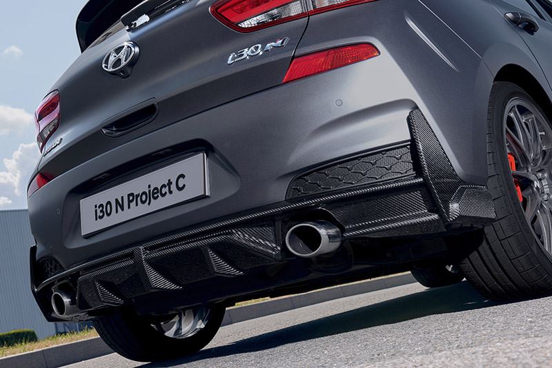 Tot de unieke specificaties van de Hyundai i30 N Project C behoren duidelijk zichtbare en met koolstofvezel versterkte kunststof carrosseriedelen (CFRP, Carbon Fiber Reinforced Plastic). Zowel de voorbumperspoiler, de diffuser achter, de motorkap en de zijskirts met N-logo zijn uit dit lichte materiaal vervaardigd. De Project C weegt hierdoor minder dan de i30 N en rijdt bij hoge snelheden strakker over het asfalt. Bovendien is het design van de gelakte carrosseriedelen prachtig om te zien. Ondanks de grotere oppervlakte van de voorzijde en het feit dat hij dichter bij de weg ligt, is de Cw-waarde van de Project C net zo laag als die van de i30 N, namelijk 0,32. Diverse aerodynamische aanpassingen zorgen ervoor dat de gelimiteerde uitvoering Project C sneller rijdt en stabieler op de weg ligt – twee ingrediënten voor het betere bochtenwerk.