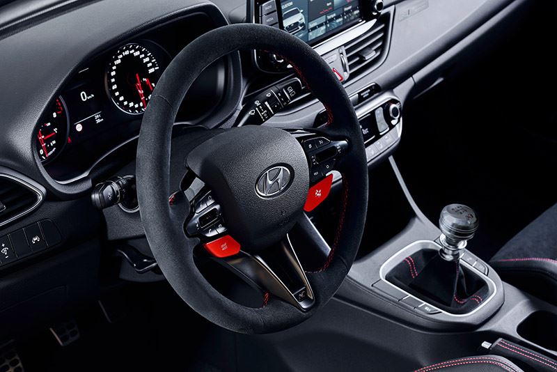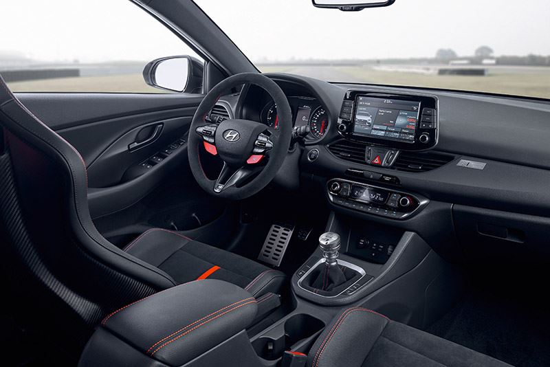 In het interieur van de Hyundai i30 N Project C is veel alcantara te vinden, onder meer op het stuurwiel en bij de versnellingshendel en handrem. De pookknop van geborsteld aluminium past perfect in de hand, wat een bijdrage levert aan de ultrakorte schakelbewegingen die de bestuurder kan maken. Zowel de veiligheidsgordels als de remklauwen zijn uitgevoerd in de opvallende kleur Deep Orange. Dezelfde kleur is terug te vinden in de stiksels van de nieuwe Sabelt-kuipstoelen. Ook de Drive mode-schakelaar en de N-schakelaar op het stuurwiel zijn uitgevoerd in Deep Orange. Een speciale badge (xx/600) aan de passagierskant benadrukt het exclusieve karakter van de Hyundai i30 N Project C.