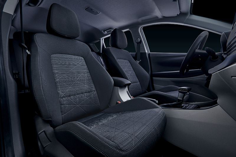 Zorgvuldig geselecteerde neutrale kleuren en materialen voor de interieurbekleding combineren optimaal met de carrosseriekleuren. In combinatie met kleine en subtiele accenten creëert het interieurconcept een rustige atmosfeer waarin de bestuurder zich optimaal op het rijden kan concentreren. De Hyundai BAYON voorzien van een volledig zwart interieur, met keuze uit twee soorten patronen op de stoffen bekleding van de stoelen.