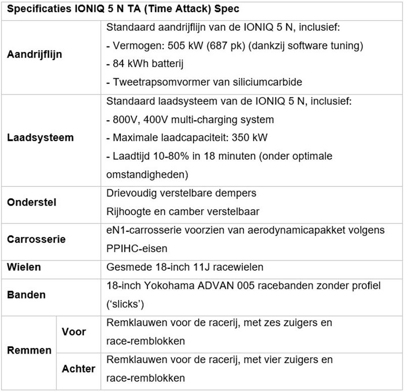De 504 kW (687 pk) sterke IONIQ 5 N TA (Time Attack) Spec is ontworpen om de kwaliteiten van de productieversie van de IONIQ 5 N te demonstreren zonder de auto fundamenteel te veranderen. Opvallend is dat Hyundai N de standaard hoogwaardige aandrijflijn heeft overgenomen. Hyundai N gebruikt N Active Sound+ met aangepaste luidsprekers (meer dan 120 dB) om zowel de feedback voor de bestuurder te verbeteren als de sirenes te vervangen die elektrische Pikes Peak-auto’s moeten hebben.