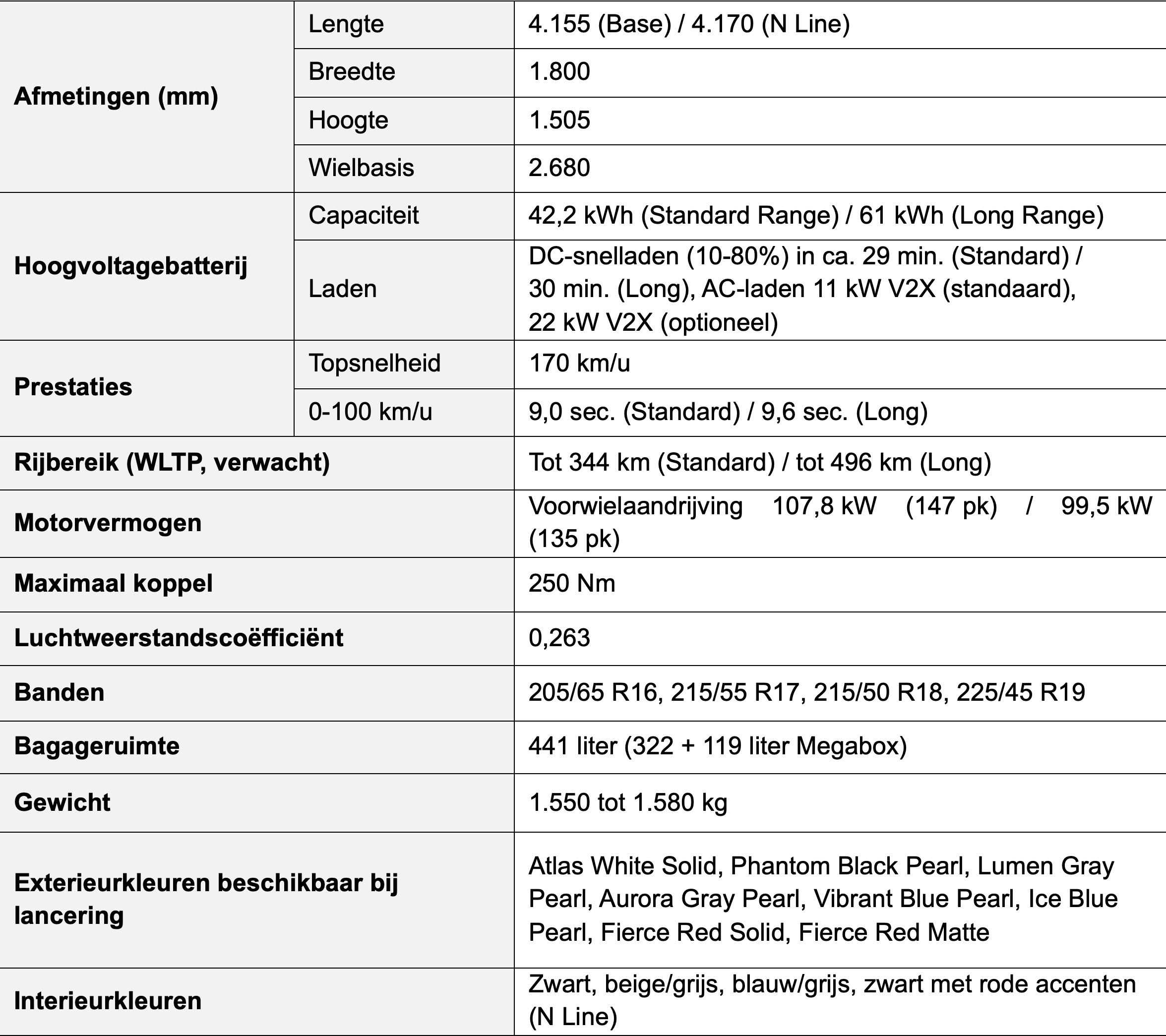 Er is keuze uit twee accupakketten, met een verwacht WLTP-rijbereik tot 344 kilometer (Standard Range) en 496 kilometer (Long Range). Zo kan worden gekozen voor de configuratie die het beste aansluit bij de levensstijl.