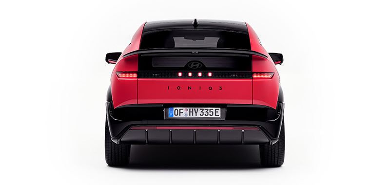 De IONIQ 3 introduceert een nieuwe ‘Aero Hatch’-typologie met een silhouet dat is geoptimaliseerd voor zowel aerodynamische efficiëntie als een ruim interieur. De lage en gestroomlijnde voorzijde loopt over in een kenmerkende daklijn die recht over de inzittenden voor en achter loopt en vervolgens afloopt naar de achterspoiler. Deze vorm zorgt voor maximale interieurruimte, meer hoofdruimte en extra comfort voor de achterpassagiers.