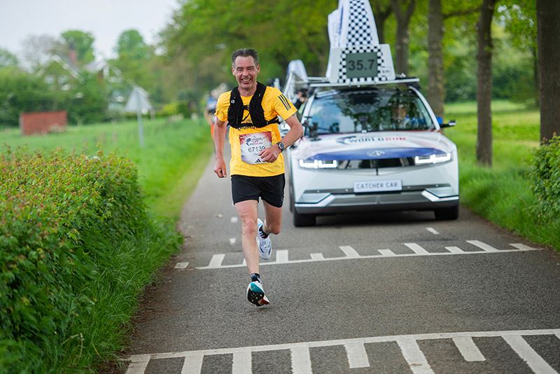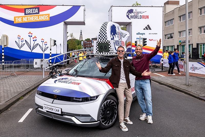 De Wings for Life World Run is in meerdere opzichten uniek. Zo is de finishlijn van het hardloopevenement geen tastbare lijn op een stuk asfalt, maar een bewegende finishlijn in de vorm van een auto. In Breda is die auto een volledig elektrische Hyundai IONIQ 5 die dertig minuten na de start van de run begint te rijden. Deze zogenoemde Catcher Car versnelt langzaam en haalt alle deelnemers één voor één in. Na 1 uur is de finishlijn bij 7 kilometer, na 2 uur bij 23 kilometer, na 3 uur bij 40 kilometer en na 4 uur bij 64 kilometer. Een deelnemer is gefinisht zodra hij of zij is ingehaald door de Catcher Car. Net als vorig jaar zitten voormalig Formule 1-coureur Robert Doornbos en topschaatser Kjeld Nuis achter het stuur van de IONIQ 5.