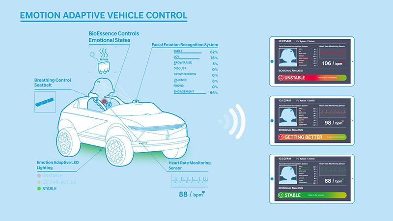 Het Facial Emotion Recognition System in de miniauto maakt gebruik van een camera die de emoties van het kind achter het stuur herkent. Een ademhalingsoefeningsband wikkelt zich om het lichaam van het kind heen en kleine luchtzakken oefenen lichte druk uit om angst te verlichten en een stabielere ademhaling mogelijk te maken.