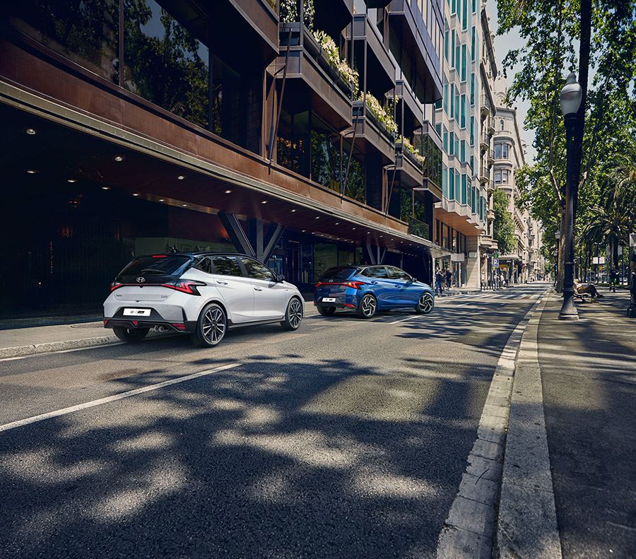 Aan de achterzijde heeft de Hyundai i20 N Line een sportievere achterbumper, een dubbele uitlaat en een driehoekig mistachterlicht. Daarnaast vallen de 17-inch lichtmetalen N Line-velgen met tweekleurige afwerking op. Er is keuze uit zes exterieurkleuren: Polar White, Sleek Silver, Aurora Grey, Dragon Red, Intense Blue en Phantom Black, al dan niet met een stijlvol Phantom Black-kleurig dak.