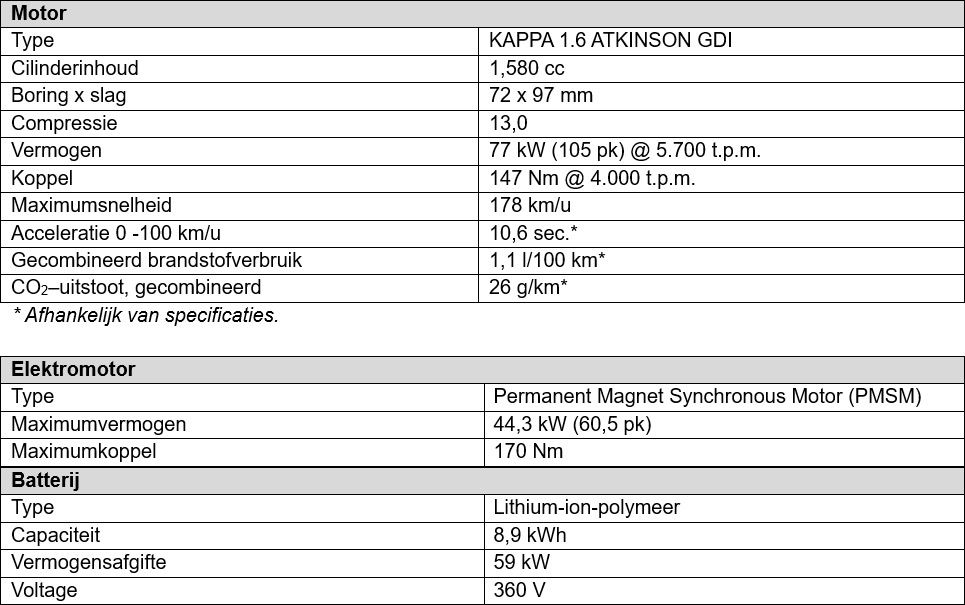 De Hyundai IONIQ Hybrid en de Hyundai IONIQ Plug-in Hybrid zijn beide voorzien van de nieuwe 1.6-liter Kappa GDi-benzinemotor met ’s werelds hoogste thermische efficiency (40 procent). De krachtbron werkt volgens het principe van de Atkinson-verbrandingscyclus: door inlaatkleppen langer geopend te houden dan gebruikelijk, nemen zogenoemde pompverliezen (lees: weerstand) af. Dat is gunstig voor het verbruik en de CO2-uitstoot.